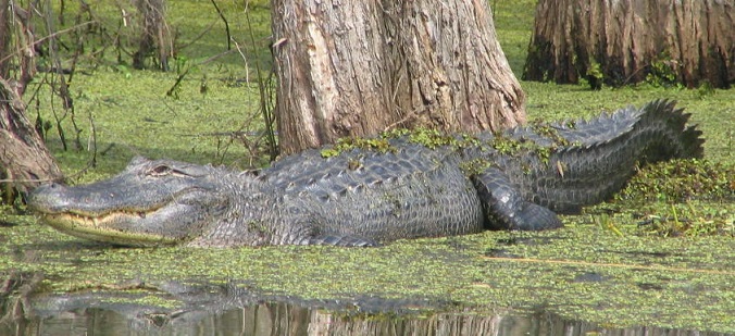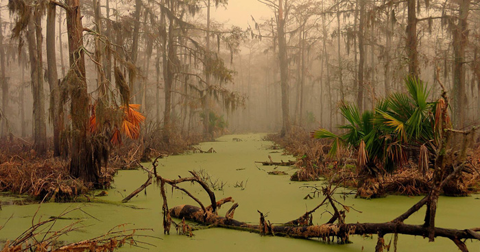 Il vento smorza le foglie, la brezza è altrettanto rara come la pioggia nel deserto del Sahara. La puzza che sale dall’acqua sembra appiccicoso come la gelatina. I legni coperti di muschio sporgono dall’acqua, la superficie delle paludi sono i cadaveri semi-decomposti degli uccelli che servono gli alligatori abbondano di cibo qui. La migliore natura per le riprese di un film horror non possono essere trovate.