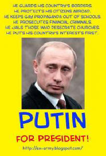 Le iscrizioni sul poster dall’alto verso il basso: custodisce i suoi confini paese; protegge i suoi cittadini all’estero; ha vietato nelle scuole propaganda gay; insegue criminali finanziari; lui pianta dentro le prigioni di coloro che bestemmiano nelle chiese; mette gli interessi del paese al di sopra del loro. Putin al Presidente!