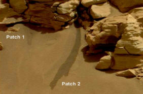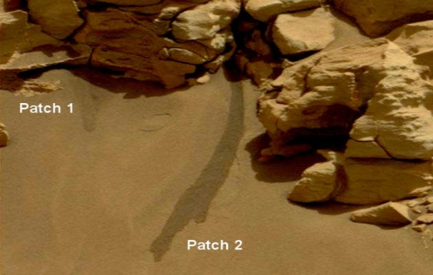 Come puoi vedere in primo piano di seguito, due punti bagnati chiaramente visibile sulla sabbia marziana.