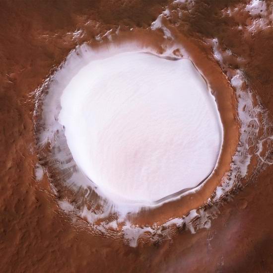Lancio della stazione interplanetaria automatica Mars Express nel 2003 nell’orbita del Pianeta Rosso dallo Spazio europeo agenzia, ha fotografato due volte un cratere pieno di ghiaccio Regina, dal nome del progettista spaziale sovietico Sergey Korolev e situato nel cosiddetto Mare del Nord Marte. L’ESA sembra aver pubblicato queste immagini in Buon Natale e Felice Anno Nuovo.