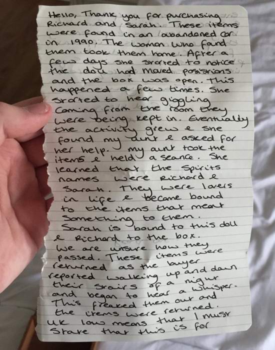 C’era una bambola di porcellana con un abito vittoriano una scatola separata e una nota curiosa era allegata ad essa, scritto da un individuo sconosciuto. In un messaggio misterioso afferma quanto segue: