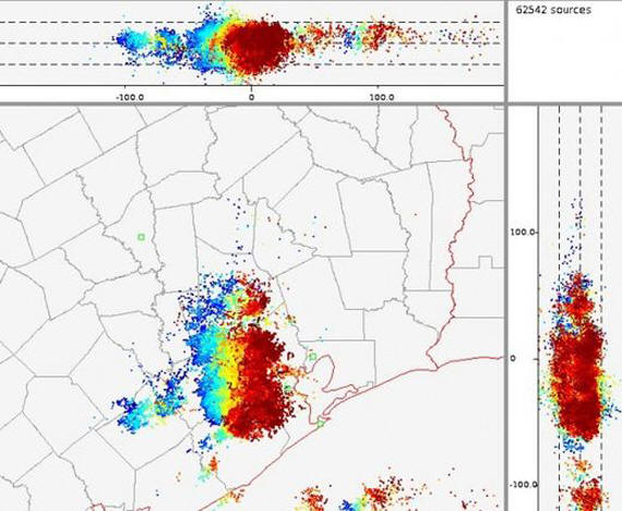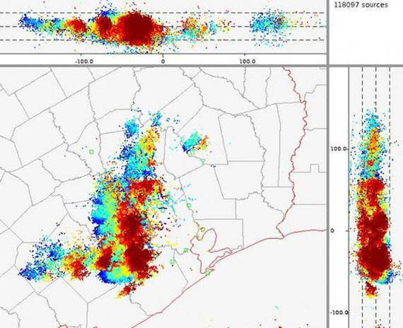 Per valutare l’evento, puoi vedere la mappa oraria. I fulmini sono mostrati qui, secondo il modello – nuvola-terra e nuvola- nuvola entro 100 miglia da Houston.