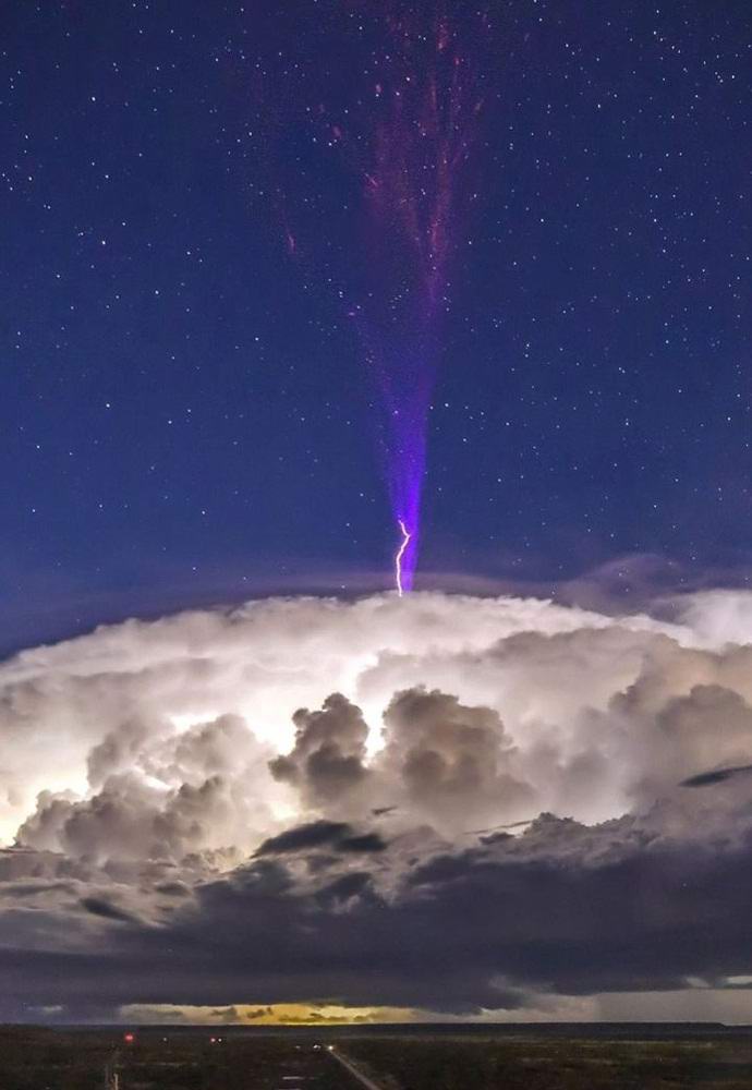 Un lampo ionosferico, uno dei quali cadde nella cornice di Jeff, incredibilmente raro. Guardare un fenomeno così naturale è grande buona fortuna, figuriamoci per scattare una fotografia – ancora di più. Focolai si verificano in l’atmosfera superiore, quindi, ha un colore viola, a volte uniforme trasformandosi in rosso.